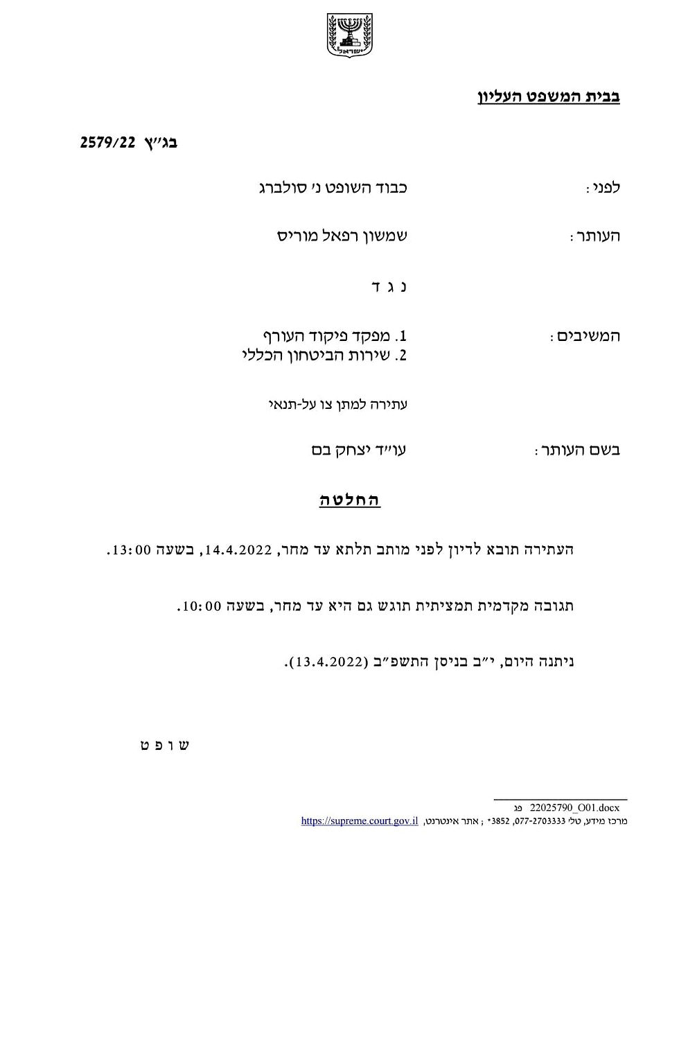 Thursday, April 14, 2022, 10:19 With the assistance of Honenu Attorney Yitzhak Bam, Raphael Morris, the chairman of the Hozrim L’Har (Returning to the [Temple] Mount) organization, petitioned the High Court of Justice to cancel an administrative order distancing him from the Temple Mount and the Old City of Jerusalem for a month and a half. The order is signed by the GOC of the Home Front Command, Major-General Ori Gordin. An urgent hearing was scheduled for 13:00 on Thursday.